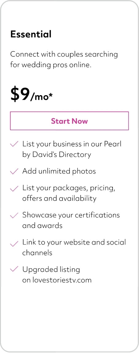 Pearl by David’s is a comprehensive wedding planning platform connecting vendors like you with couples and wedding planners! We help streamline bookings, manage appointments, and enhance your online visibility to attract more clients.
