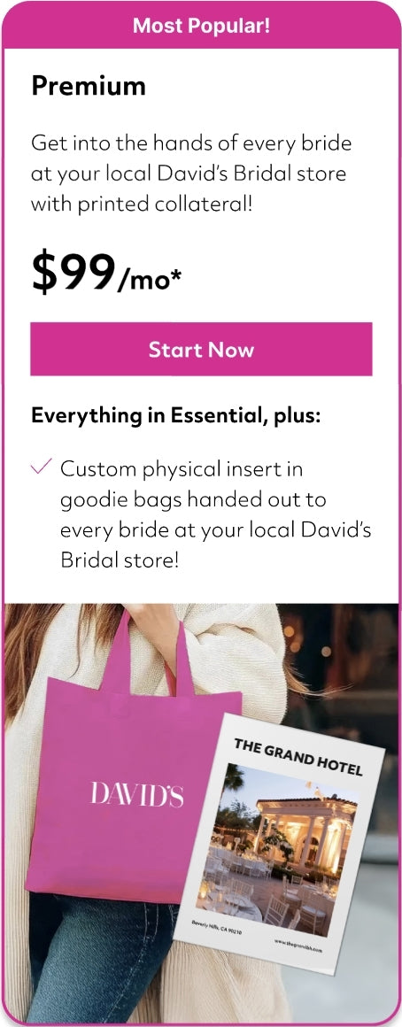 Let couples find and contact you directly through the Pearl by David’s platform, opt for in-store marketing, and more.